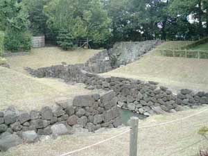 | 四足御門です。大手御門と並び東海道筋から城へ入る重要な出入口の一つで三の丸堀を土橋で渡って左手に直角に曲がり渡櫓門から城内に入る構造になっていた | 横内御門です。城内に入る北東側の出入口で三の丸堀を木橋で渡って高麗門を通り石垣で手門とも呼ばれた。二の丸堀を木橋で渡って高麗門を通り石垣で囲まれた枡形内を経て渡櫓門から三の丸に入る構造になっていた |